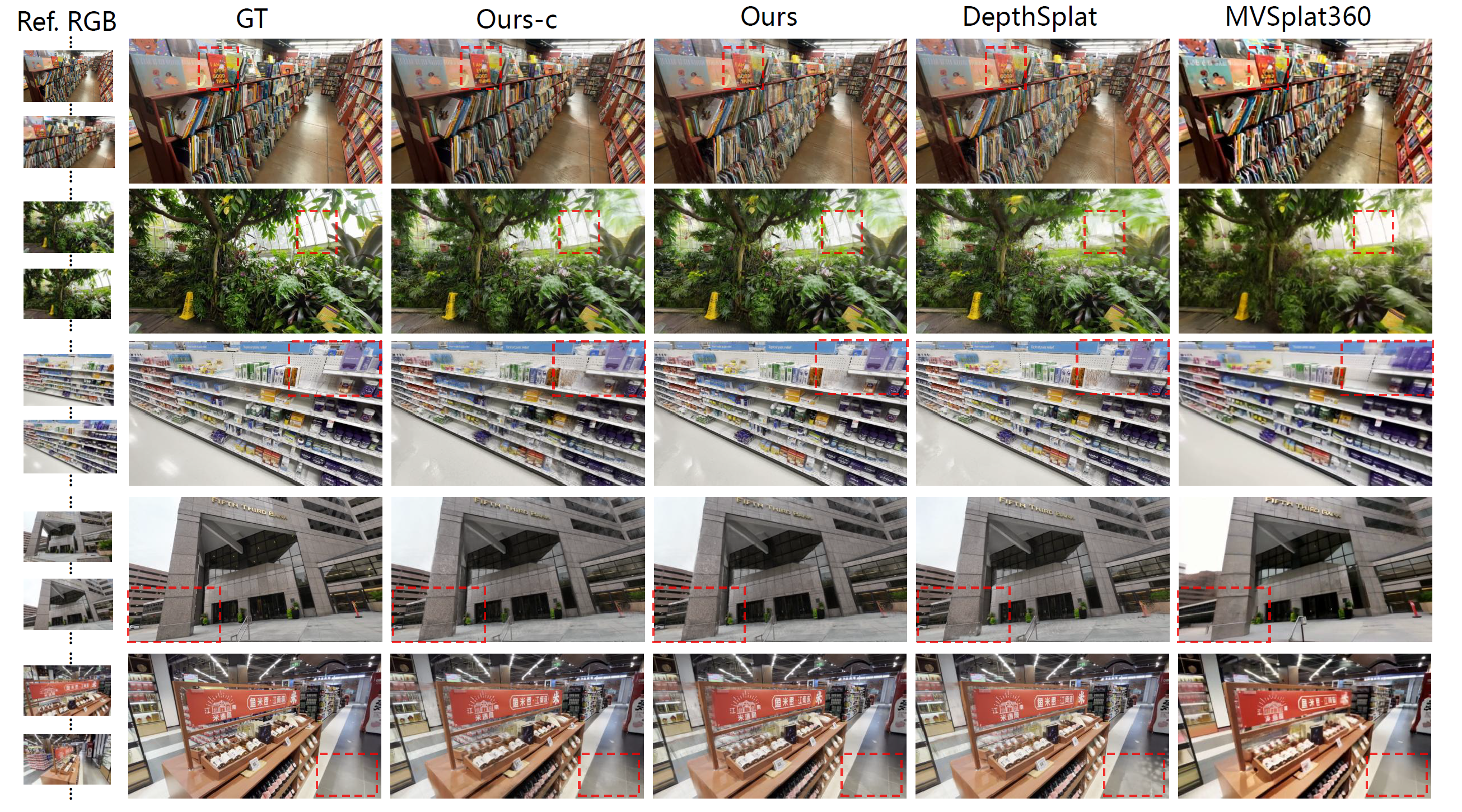 主观上,LongSplat生成的新视角图像也更加清晰一致。对比渲染结果可以发现,LongSplat有效去除了许多竞争方法中常见的“漂浮伪影”,并且更好地保留了物体的精细细节。无论是在纹理尖锐的区域,还是在复杂几何的部位,LongSplat的重建都更加准确稳定。这一点从论文提供的可视化结果中也得到了印证:LongSplat相比MVSplat360、DepthSplat等基线,生成的场景在边缘细节、物体轮廓连续性上都更胜一筹。由此可见,该方法不仅在指标上领先,视觉效果上也达到了更高的真实性和一致性。