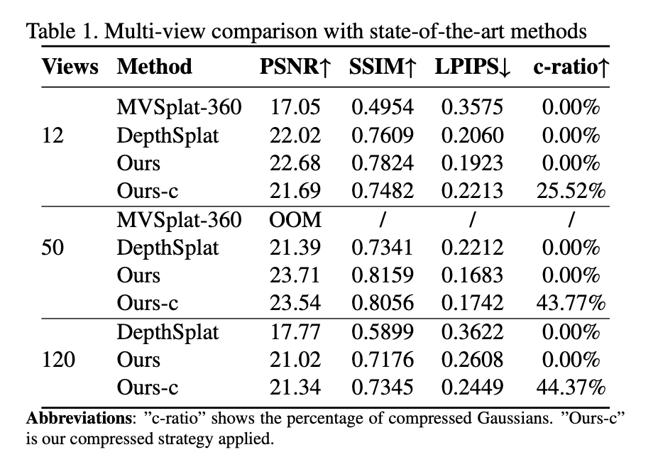 此外,LongSplat展现出优异的长序列可扩展性。当输入视角数量逐渐增加时,传统方法由于高斯点不受控增长,重建质量往往大幅下降——例如DepthSplat在120帧情况下PSNR跌至仅约17.8。相比之下,LongSplat的重建结果依然稳定:即使处理120帧,压缩版本的LongSplat仍保持了21.3 dB以上的高PSNR,且感知误差LPIPS维持在较低水平。在50帧这样的中等序列长度下,LongSplat完整模型达到约23.7 dB的PSNR,较DepthSplat提升2.3 dB,而且其压缩变体在去除约43.8%的高斯后依然有23.5 dB的PSNR,几乎不损失重建质量。这说明LongSplat能够在大幅压缩模型的同时,有效保留关键的场景信息,实现质量与紧凑性的双赢。