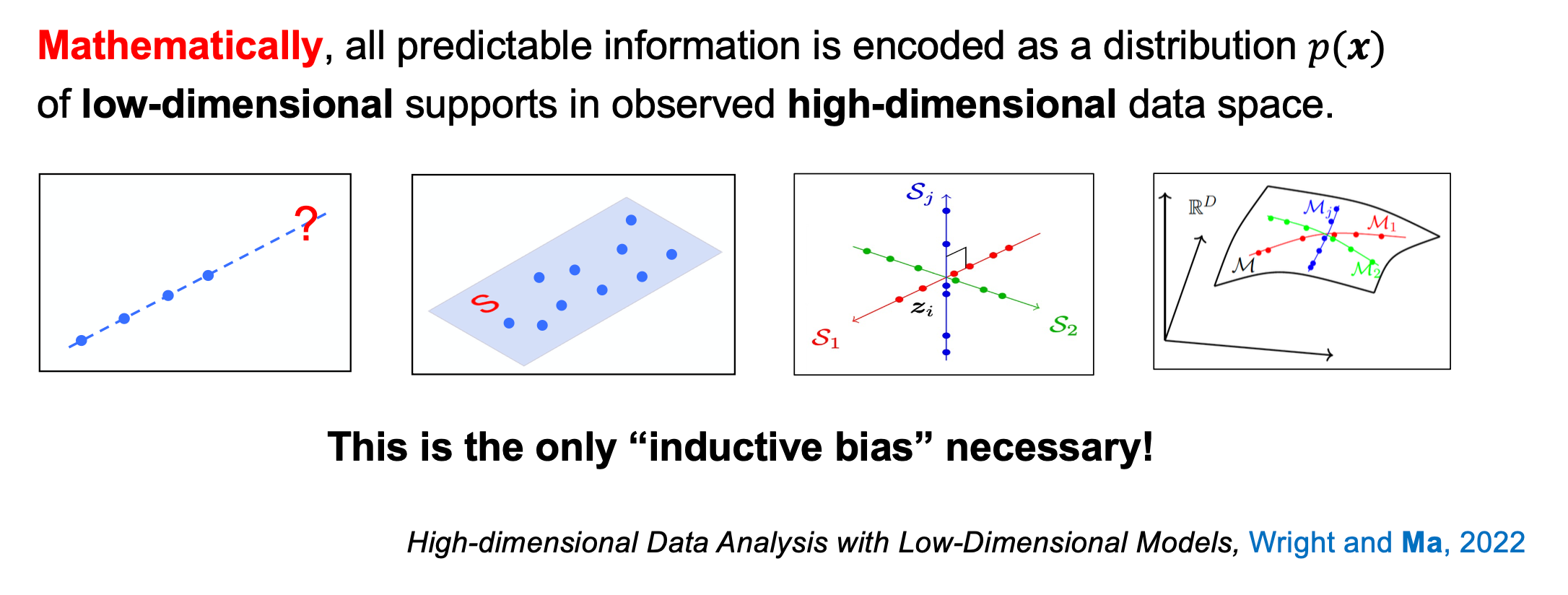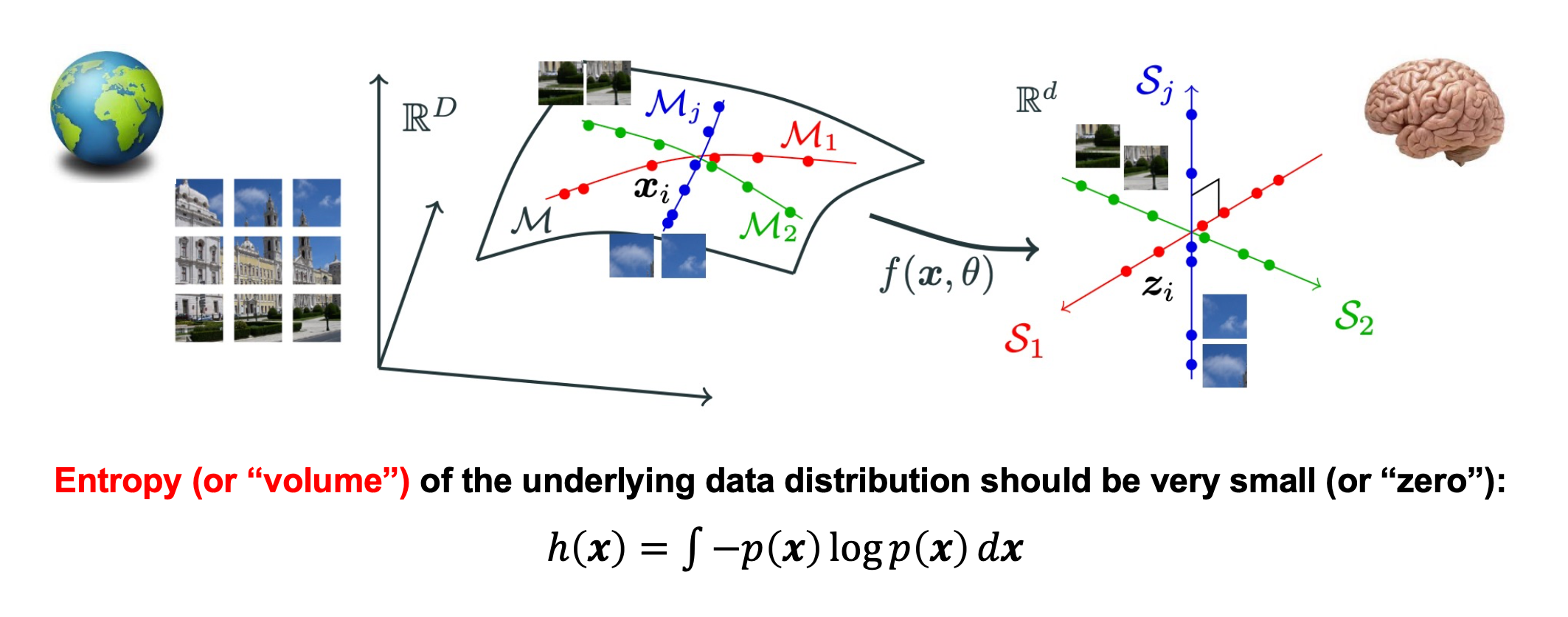 从数学角度,学习的主要目标是:从感知到的数据 𝒙 中识别出具有低维结构的分布,并将其转换为一个紧凑且结构化的表示 —— 𝒛。