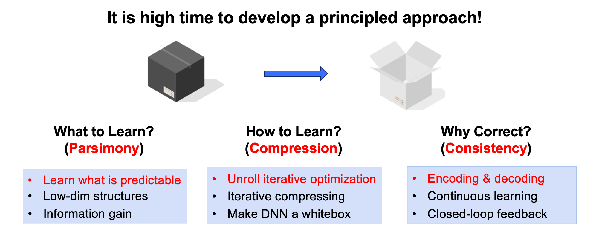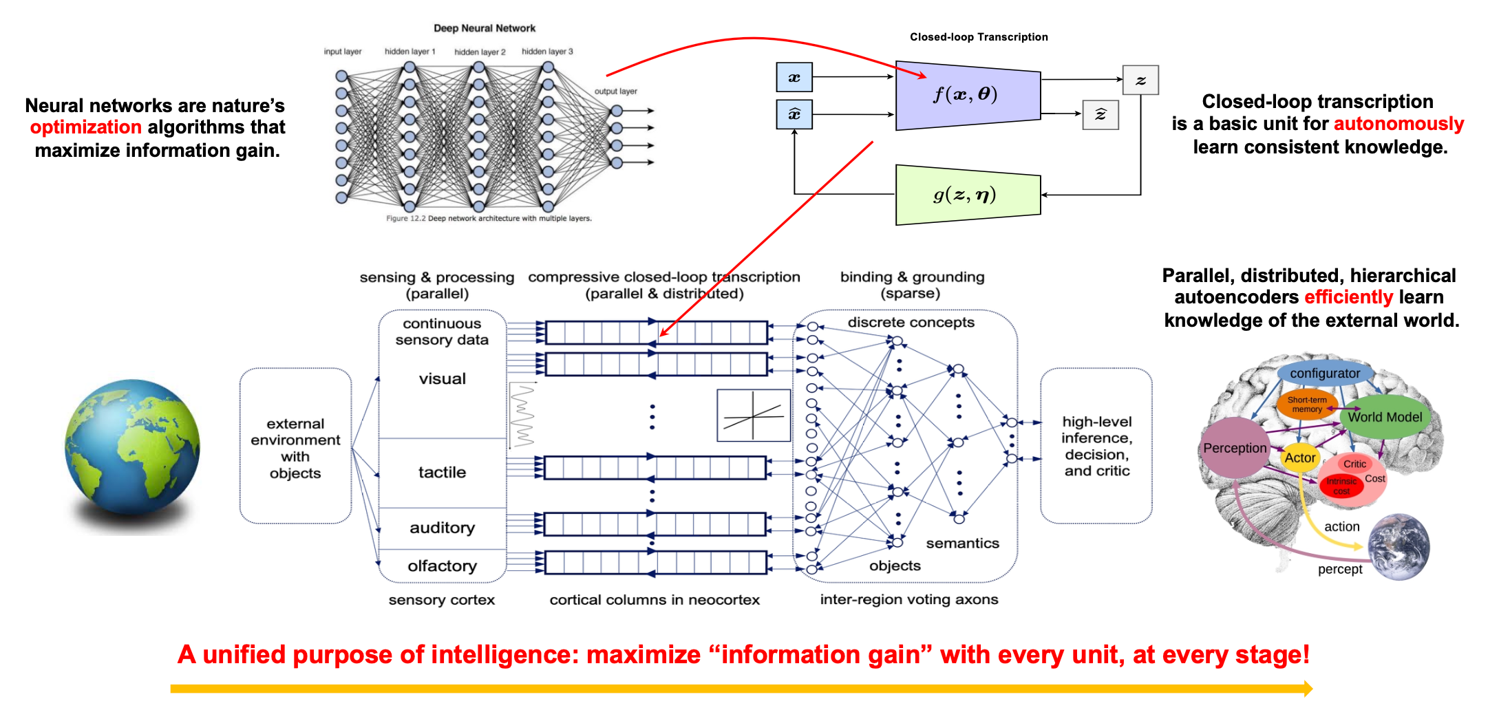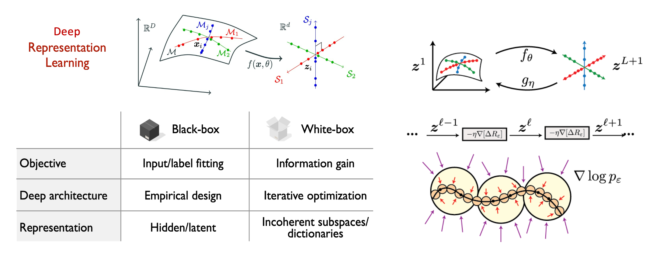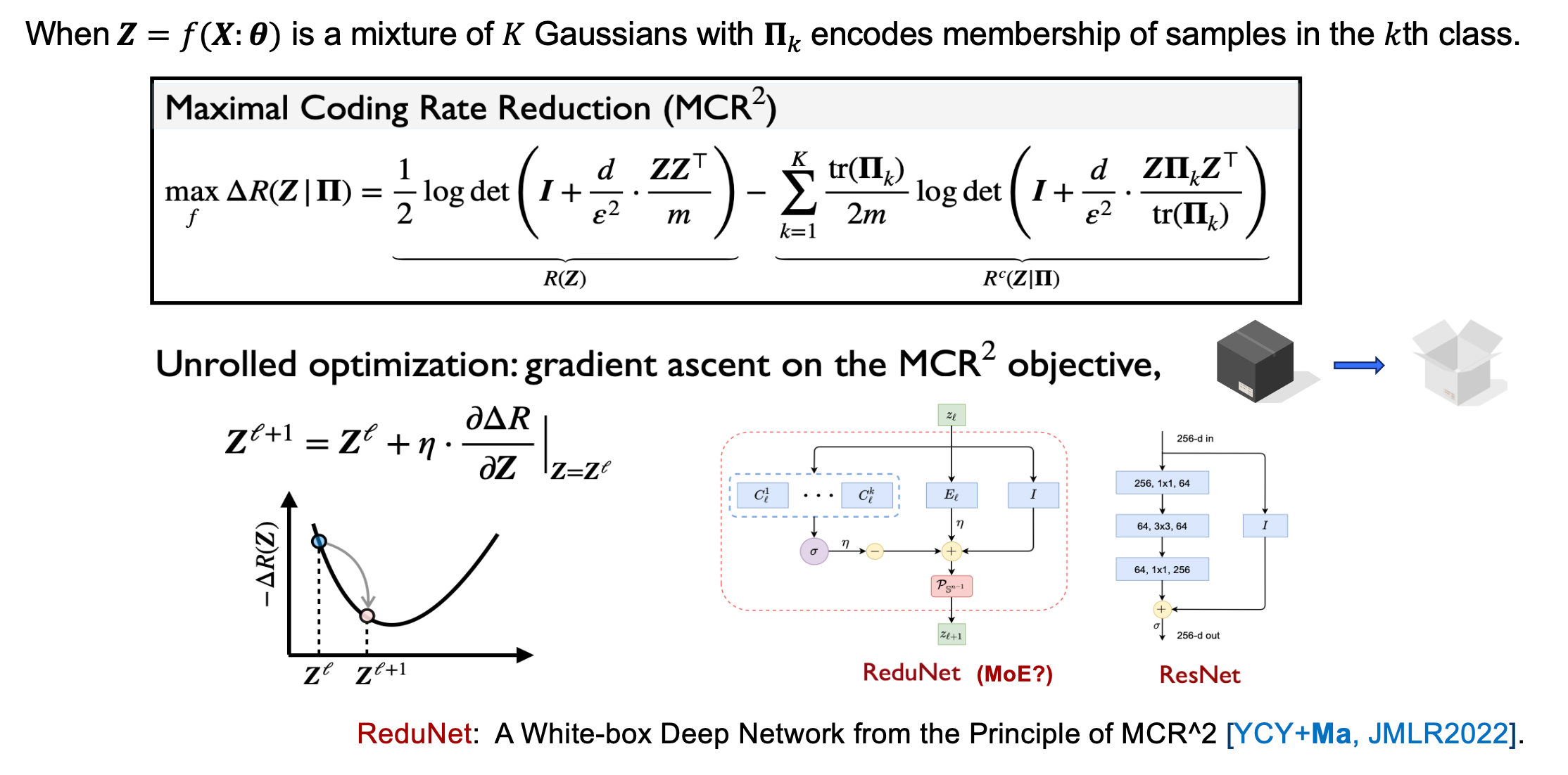 忆生创始人马毅教授的ReduNet 工作,从最大编码率压缩(MCR²)出发,将表征学习的优化过程展开为多层网络,使各层算子皆可解析推导,从而形成结构透明、可解释的白盒深度模型:
