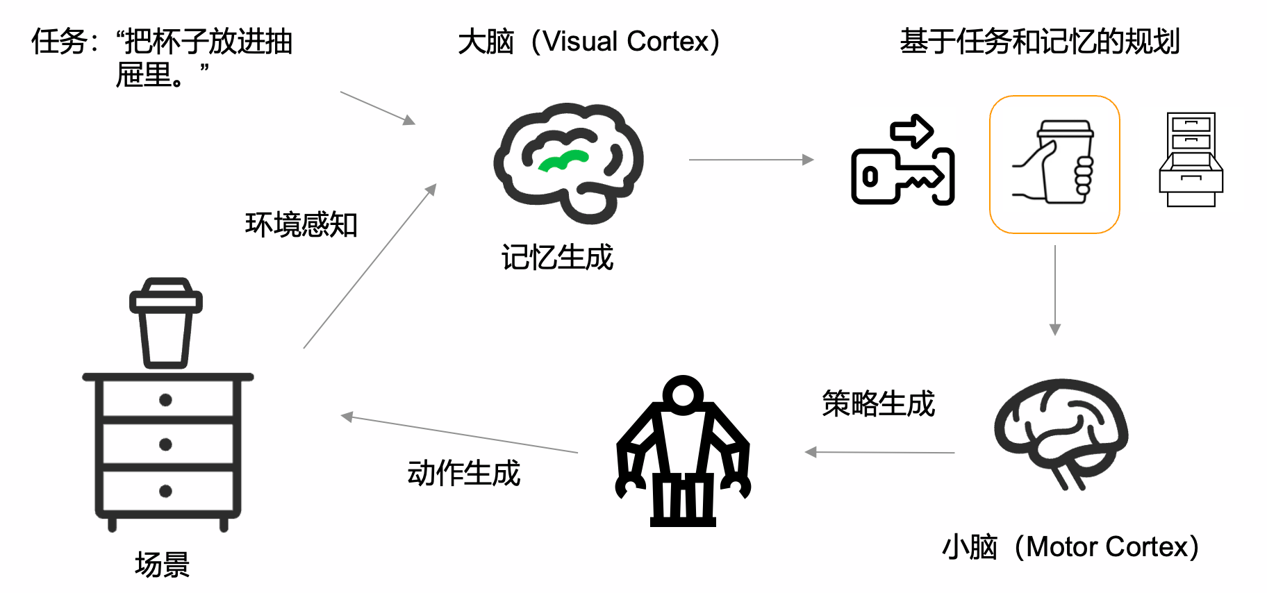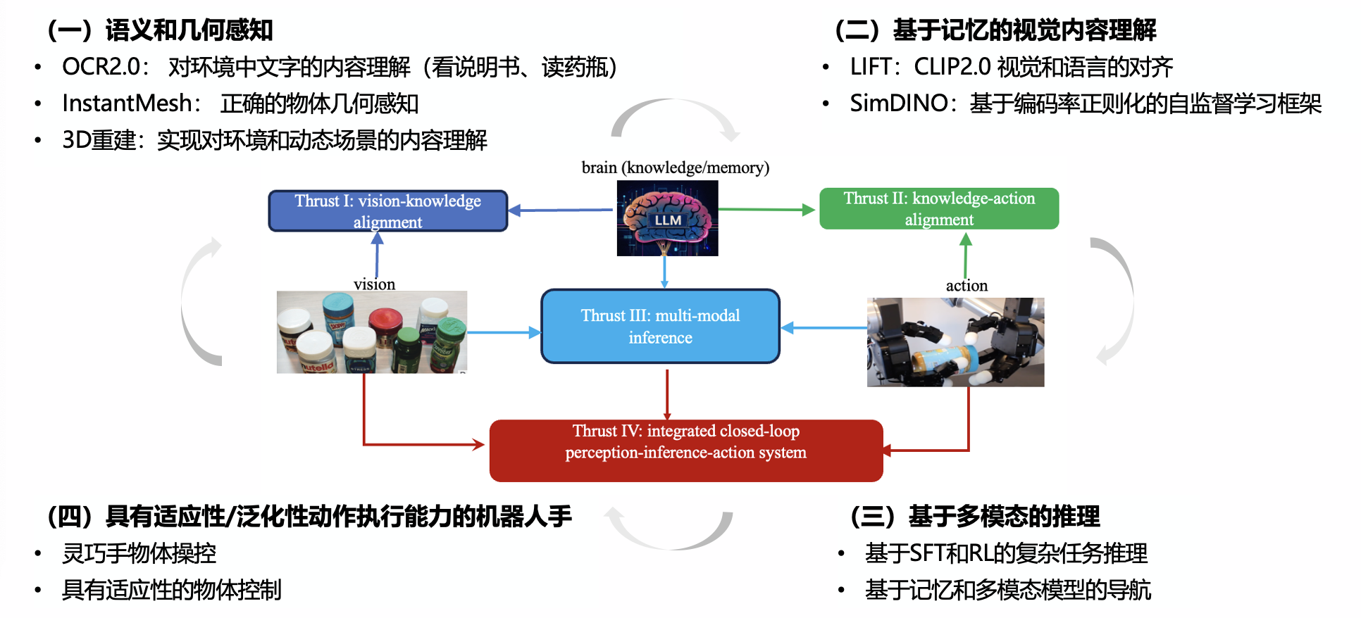 面向具身智能的需求场景,我们正在围绕大脑的记忆机制搭建起闭环系统,包括语义和几何感知、基于记忆的视觉内容理解、基于多模态的推理、具有适应性/泛化性动作执行能力的机器人手。