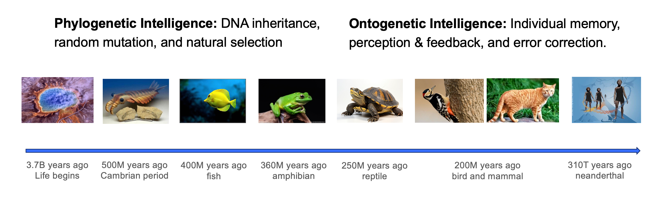我们所生存的这个世界的可预测性,成为了生命智能得以产生并不断发展的根本原因。智能的机制在生物演化中不断发挥作用,生物智能本身也在漫长的历史中逐渐演进——从依赖基因遗传和自然选择(phylogenetic,),进化到个体本身的后天学习与适应(ontogenetic)。