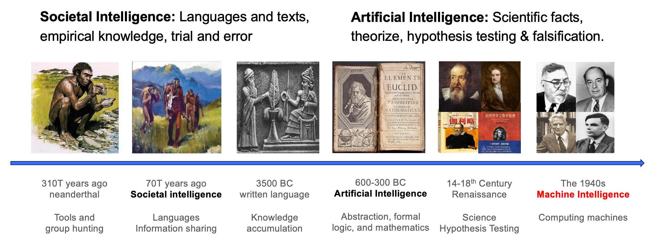文字的产生加之强大的抽象能力,让数学、科学等等人类文明成果得以产生。智能的机制进一步在人类个体和群体中发挥作用。在这个过程中,人类科技文明指数级发展。人工智能(指真正的词源本身含义)的发展依赖科学事实、理论化、假设检验与证伪。